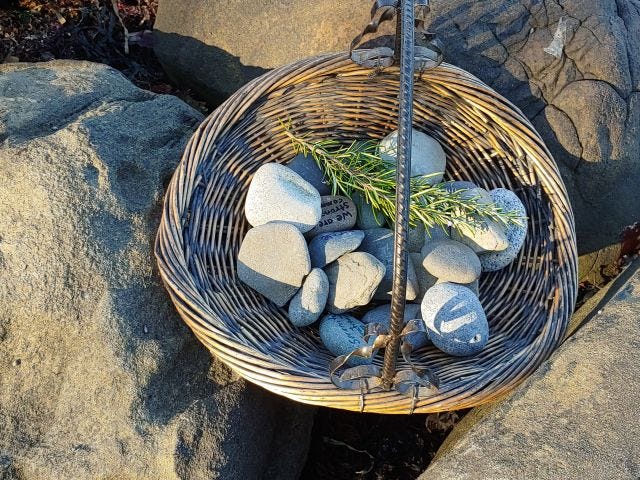 Our neighbour Nancy died of heart-complications likely related to a long flu and pneumonia she had at the start of 2020. We gave her a send-off last weekend, with appropriate social distancing, and wrote our wishes for her and ourselves on stones that I later scattered on the beach.