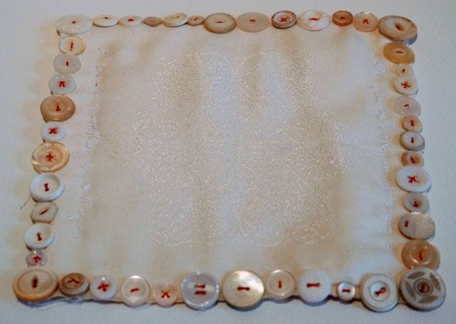 This month, I'm sharing a work in progress titled "I have something to tell you." Mixed media: textile, bone, wood, plastic, thread. A response to #metoo; a commentary on how stories are shared and received.
