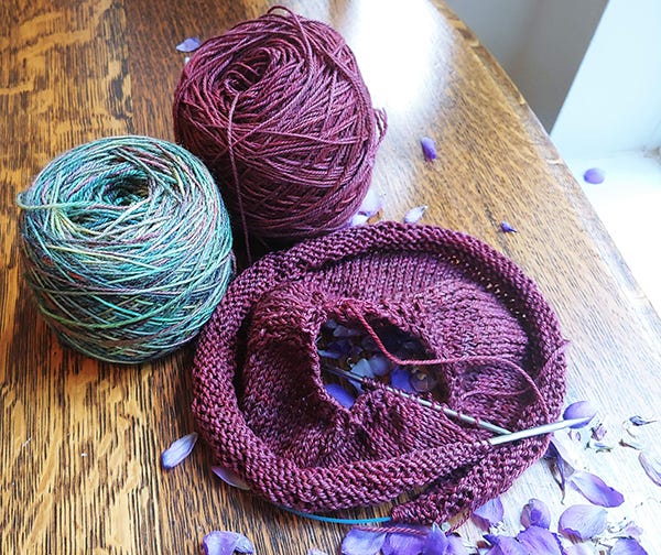 I am not one for weaving or quilting when the weather gets warm. This month, I rooted around in my stash to find some yarn to inspire an easy project for social summertime knitting. Yarns in the photo dyed by Ancient Arts (Calgary) and Sweet Georgia (Vancouver) being knit into Stephen West’s Daybreak pattern.