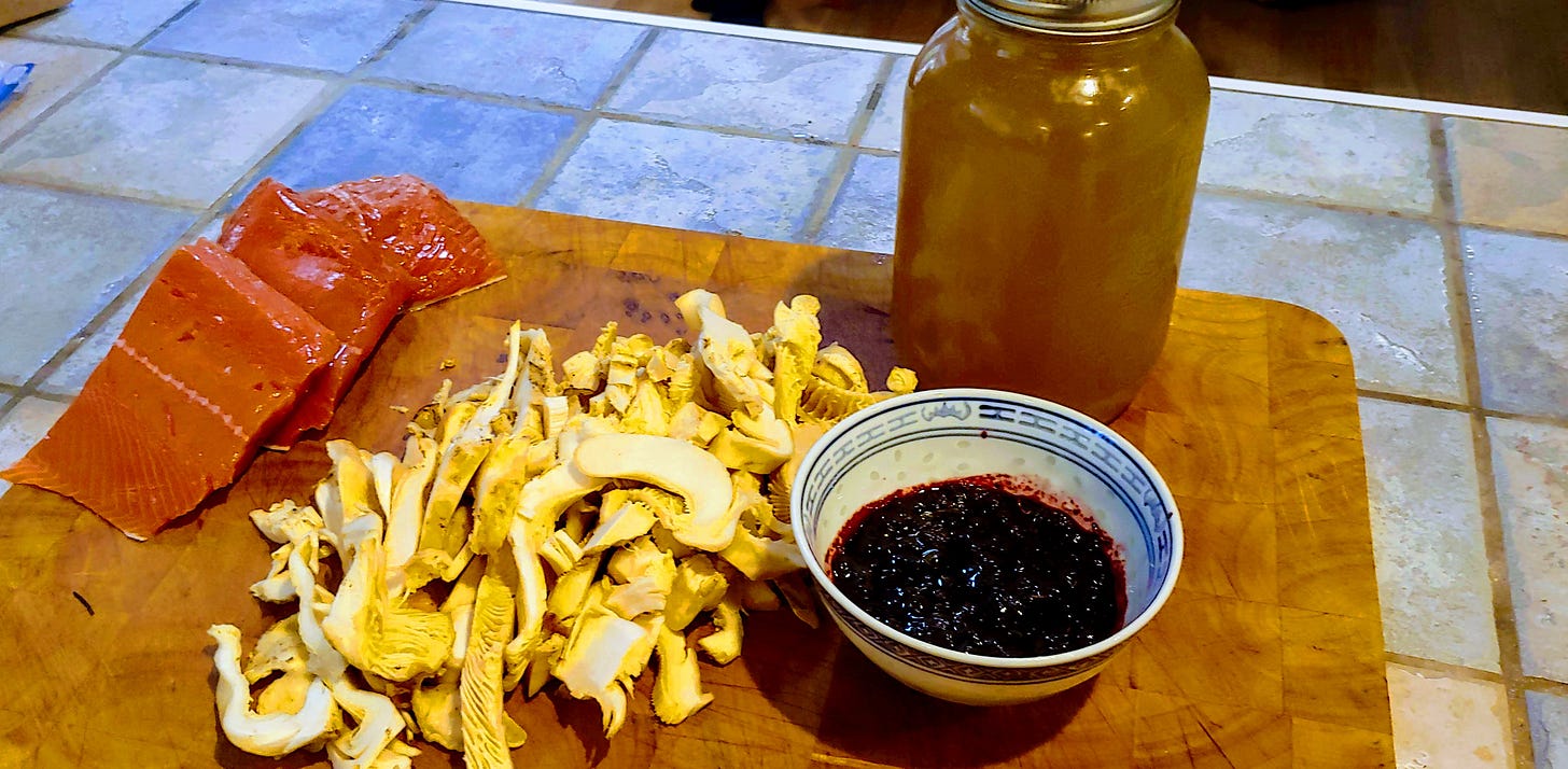 Sockeye salmon, chanterelle mushrooms, a sauce made of evergreen huckleberries, and venison stock all from on, or around, Gabriola Island.
