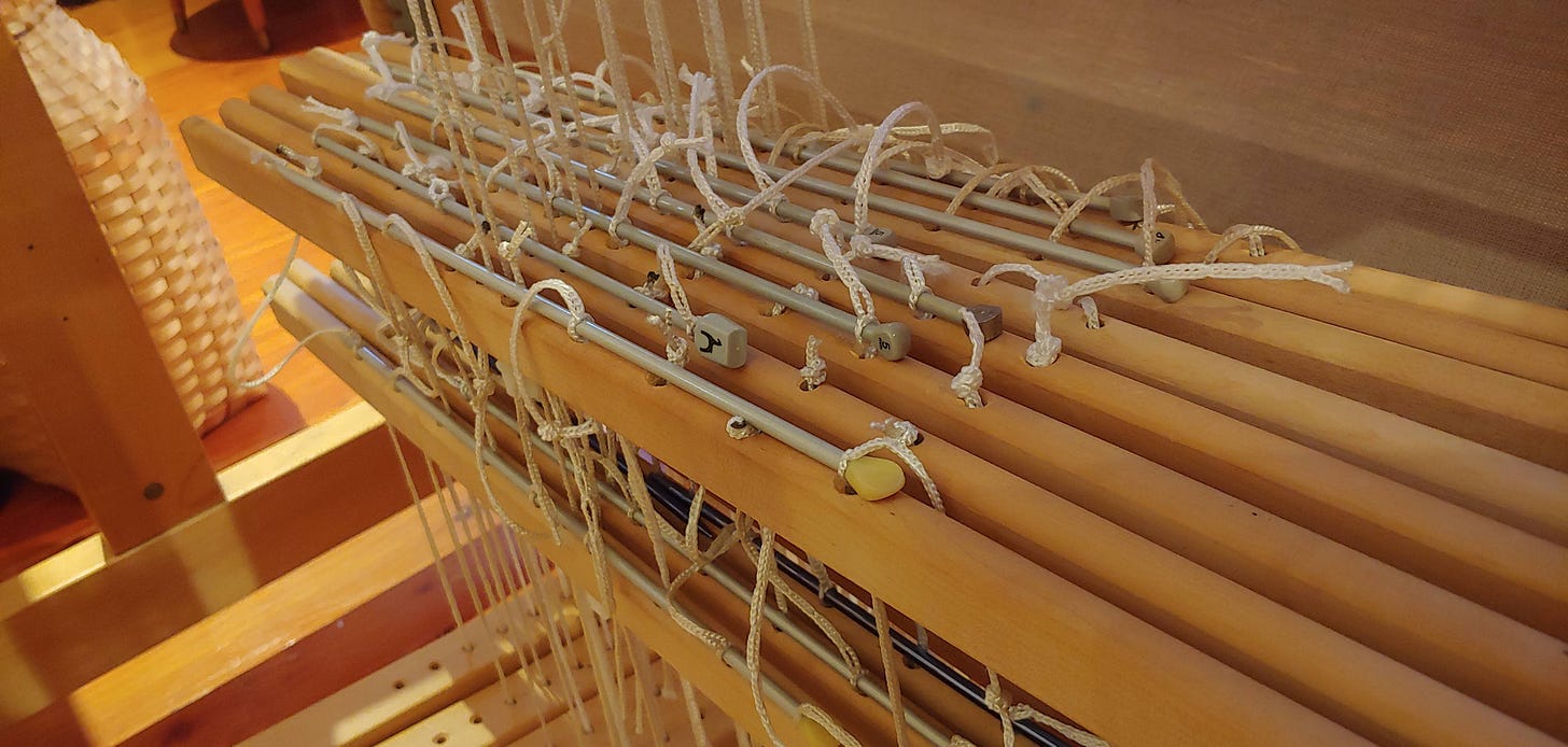 Even so, I am making headway on warping my big loom, and the photo above shows the lamm tie-up I am working with underneath. This is an entirely new-to-me way of tying up the treadles (foot pedals) and I have some adjusting to do, but I believe I will have it figured out this weekend so I can start weaving some fabric again!