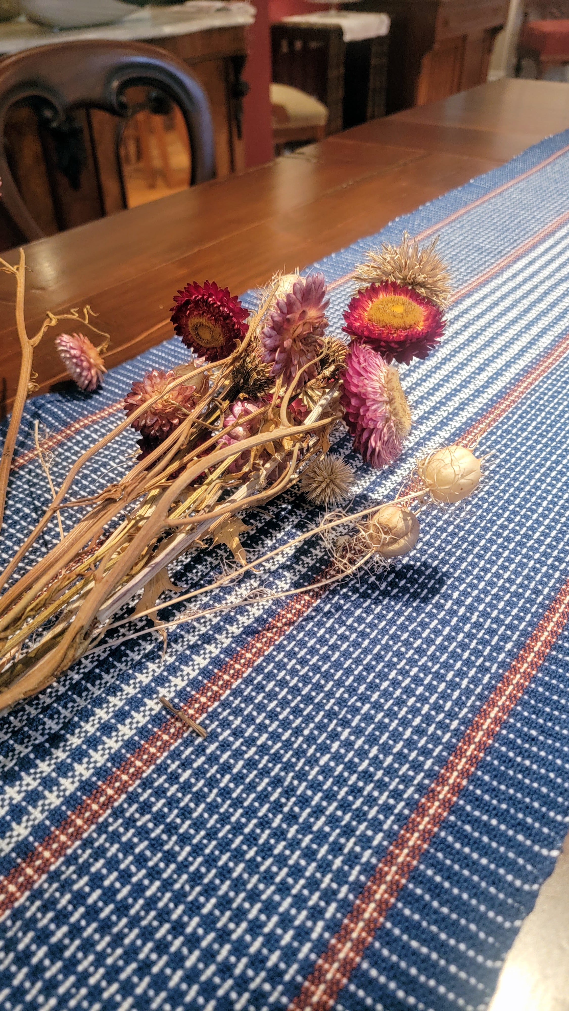 Someone I knew in childhood recently approached me and asked if I would do a weaving commission – a table runner to the length of a table her husband has recently built. She is a pottery-maker, and an interior designer herself, and I was honoured that she wanted one of my weavings in her home. I finished and delivered this piece last week and have to acknowledge that weaving for someone else made me much more attentive to the small details of the cloth than I normally am.