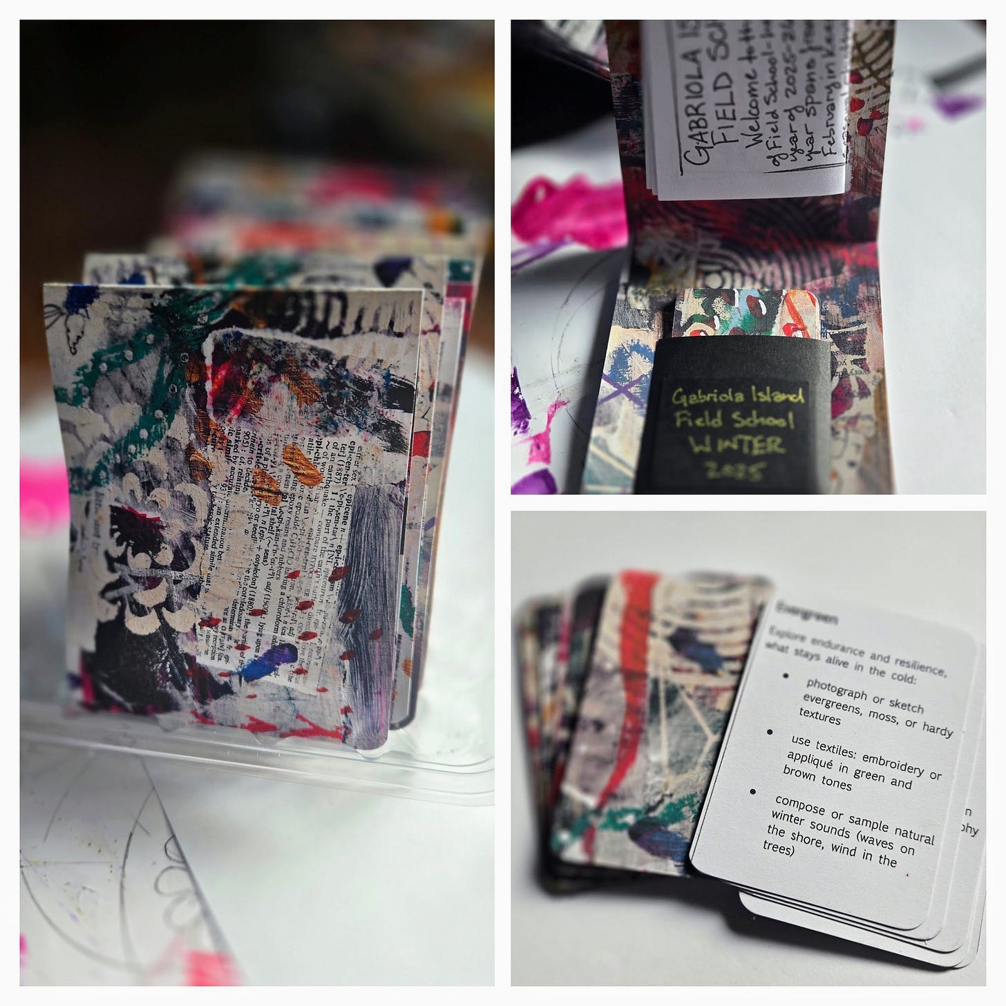 For the Field School this year, I handmade four “books” which consisted of a zine, a stab-bound pamphlet, an accordian-fold booklet, and then finally this folio with 16 winter-themed creative prompt cards inside. This field school project has been such an interesting challenge for me creatively - both in terms of content and presentation. For this folio, I created 5 mixed media collages that were copied and then cut down to size by hand to create both the folio and the creative prompt cards. I’m pretty happy with how these turned out, and with the fact that I’m done with all the field school output now so I can re-focus on other studio things for a bit.